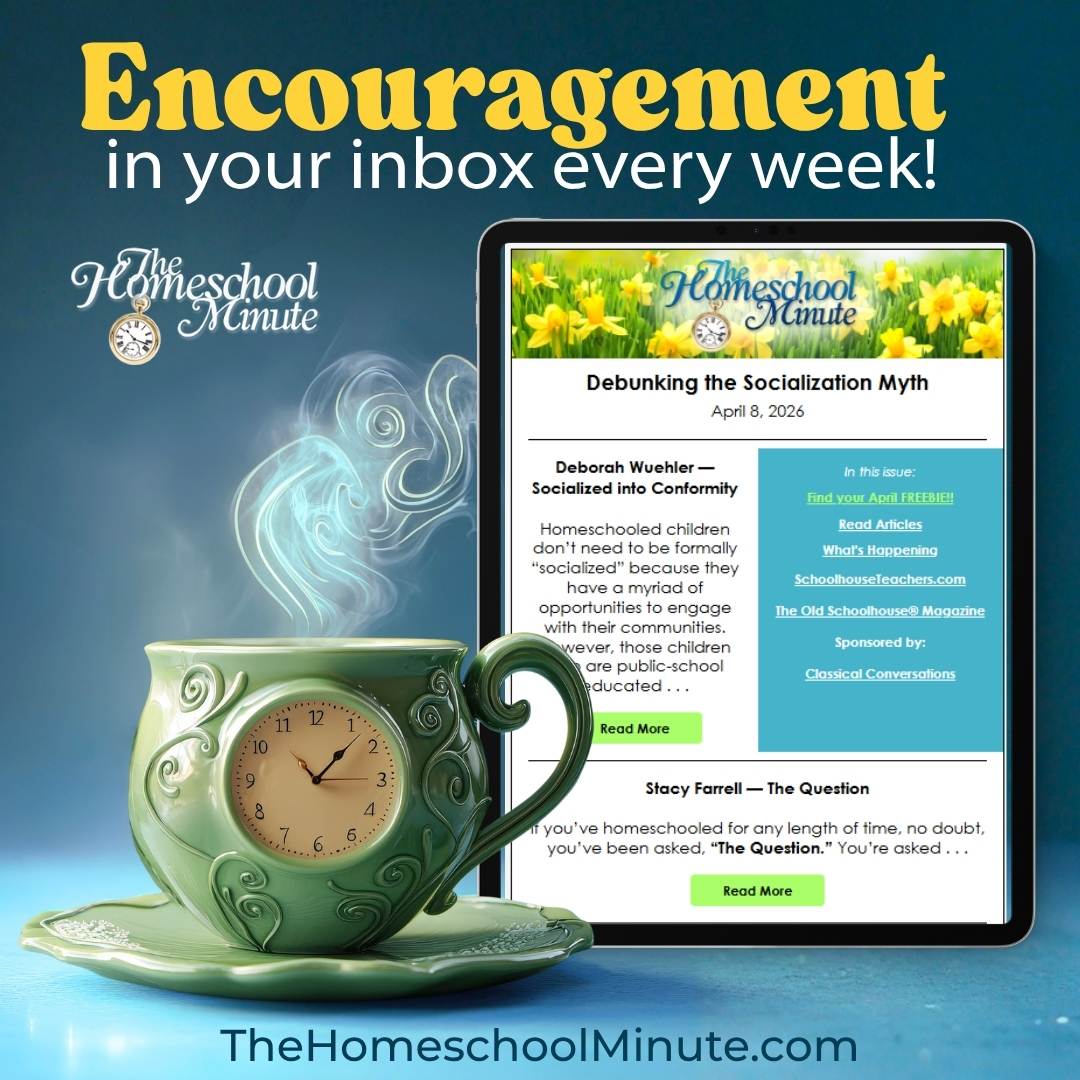 The Homeschool Minute is a free weekly newsletter from The Old Schoolhouse®, and it's been showing up in homeschool families' inboxes for over twenty years. Each issue is built around a single theme and features short, honest articles from experienced homeschool writers who know what this life looks like. The good days, the hard days, and the ones where you're not sure which it was.